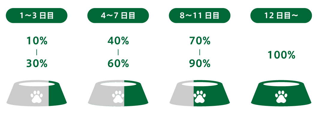 ※消化器が未発達なパピー期や、消化機能が弱い子、シニア期のワンちゃんの場合は、切り替え期間を長めに設定しましょう