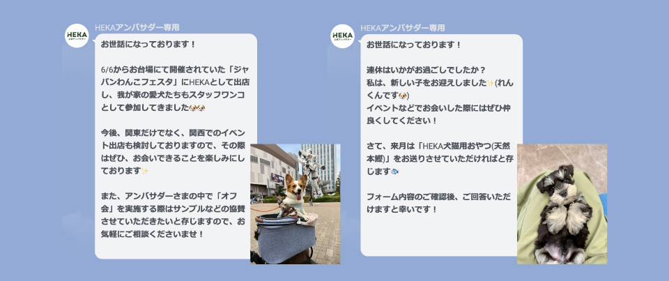 2ヶ月に1回のサイクルでHEKA商品をお送りさせていただき、SNSで「愛犬・愛猫+HEKA商品」のお写真と一緒に、率直な感想を自由にシェアしていただいています🐶🐱