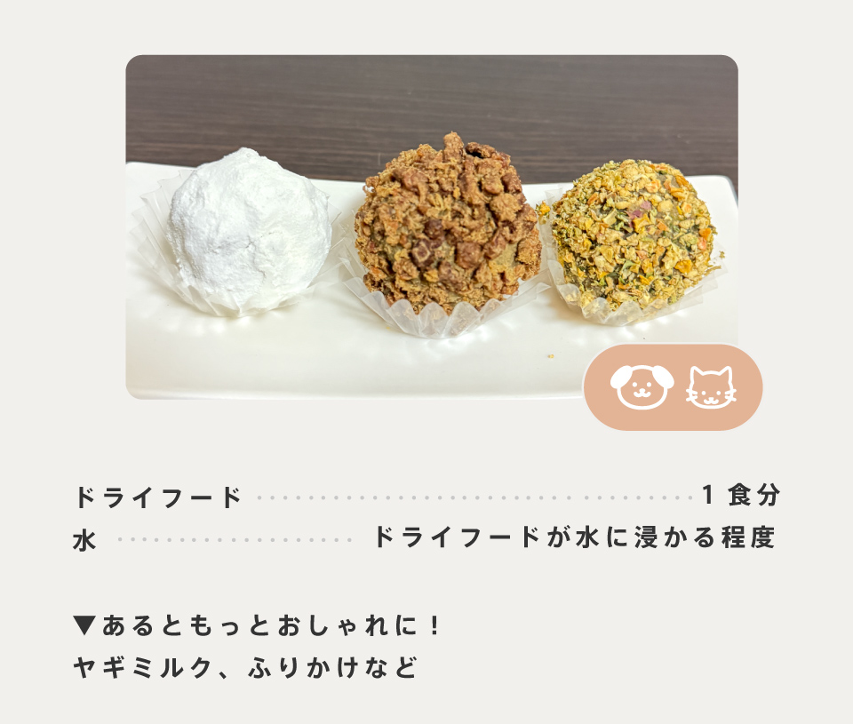 1.普段食べているドライフードと水またはぬるま湯を、器やポリ袋に入れ、10~30分ほど置いてふやかす。※ドライフードを丸めやすい柔らかさを目安に