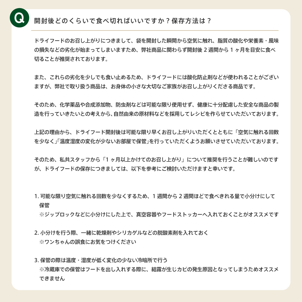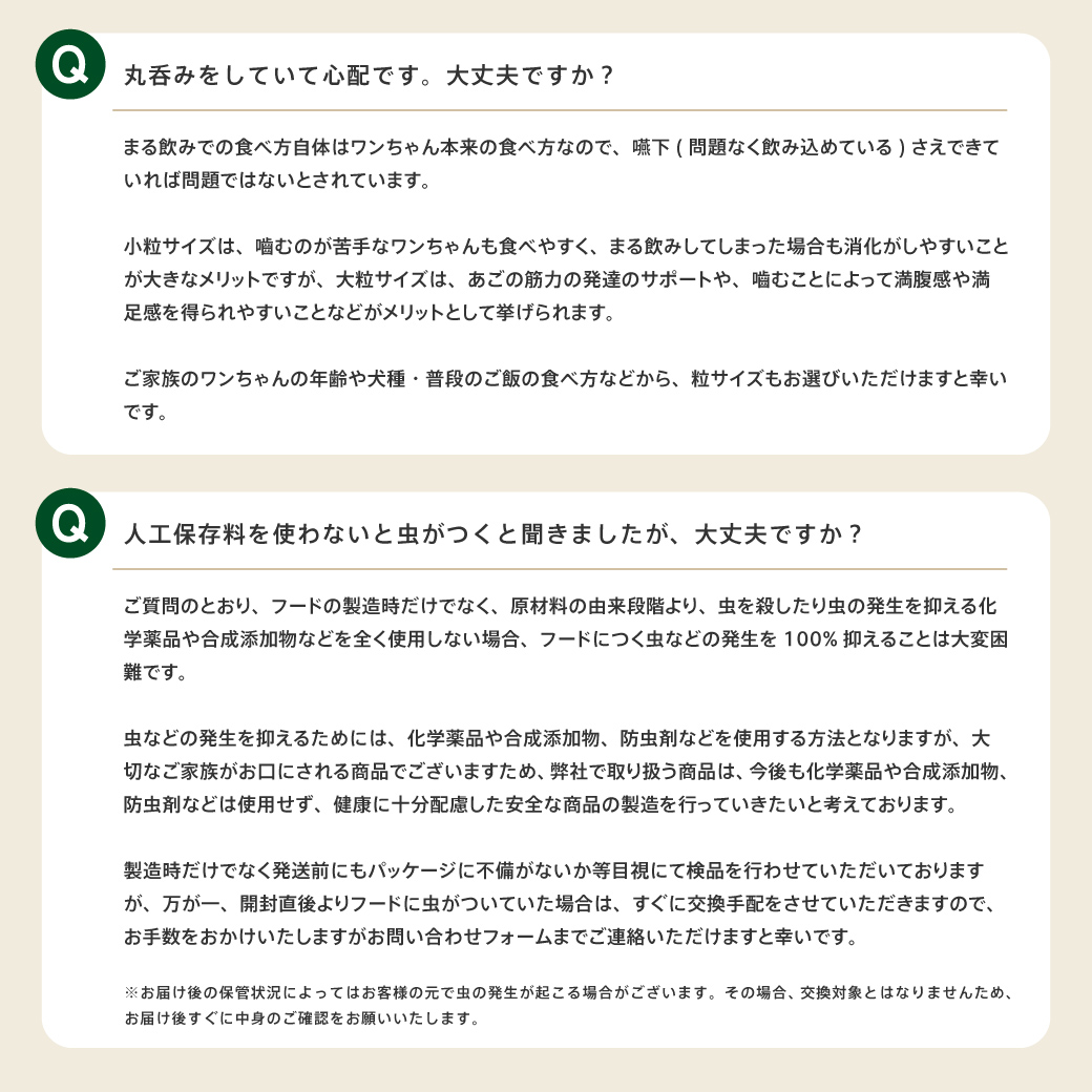 多くのドッグフードに含まれている穀類(米・大麦・小麦・トウモロコシ)や保存料・着色料などの人工添加物も一切含まれていません。